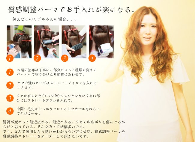 それを改善しようって言うメニューが『質感調整パーマ&ストレート』です。